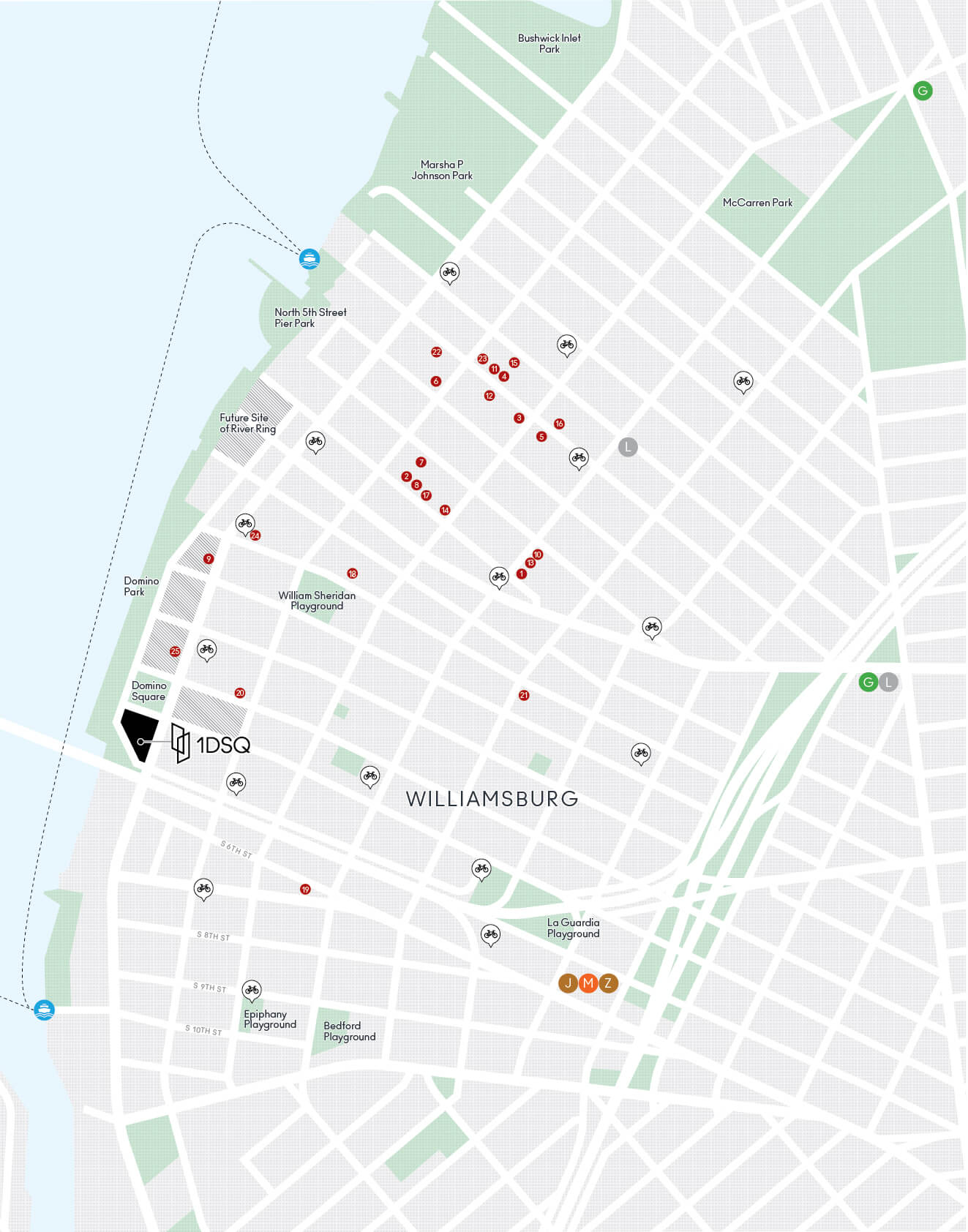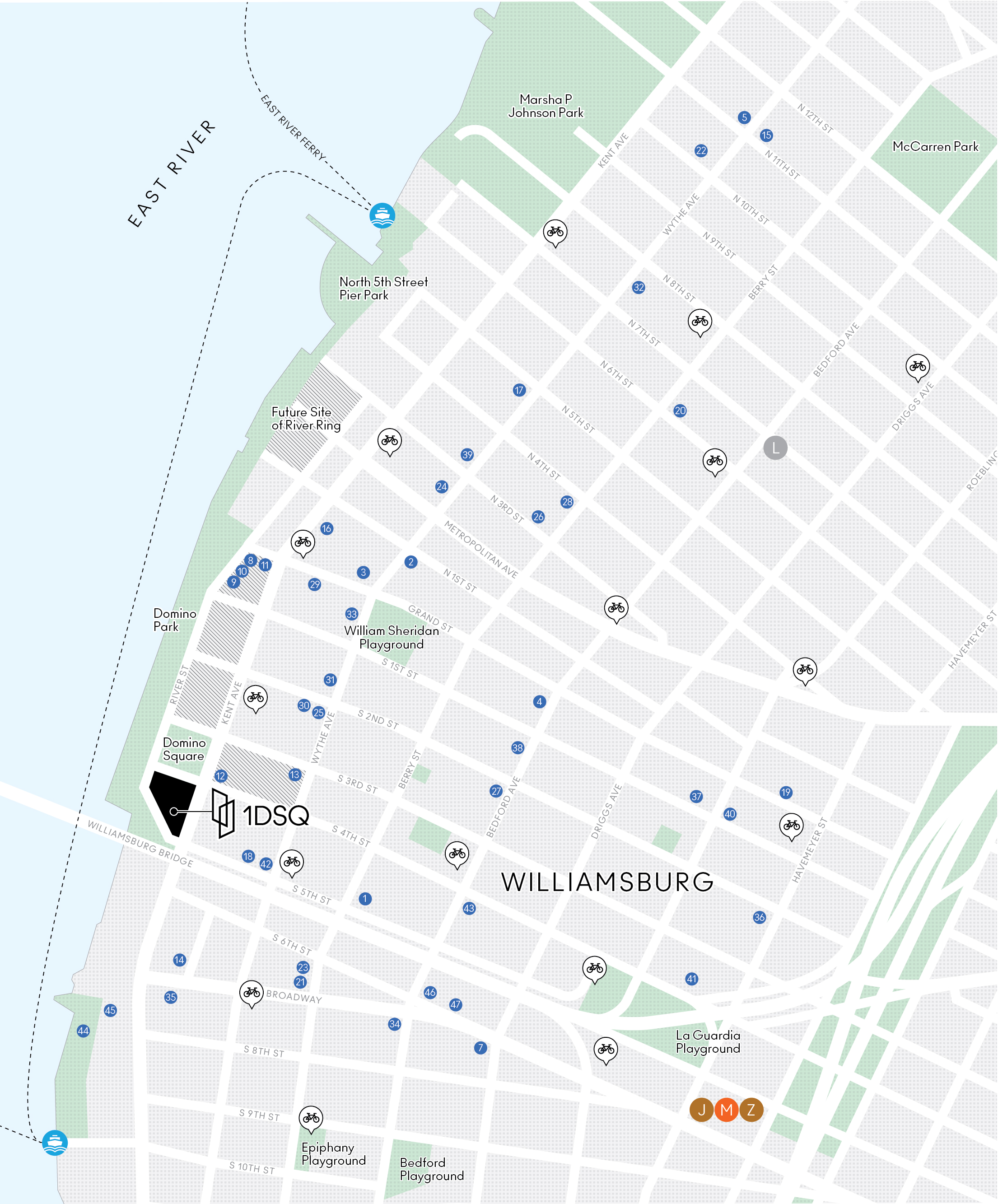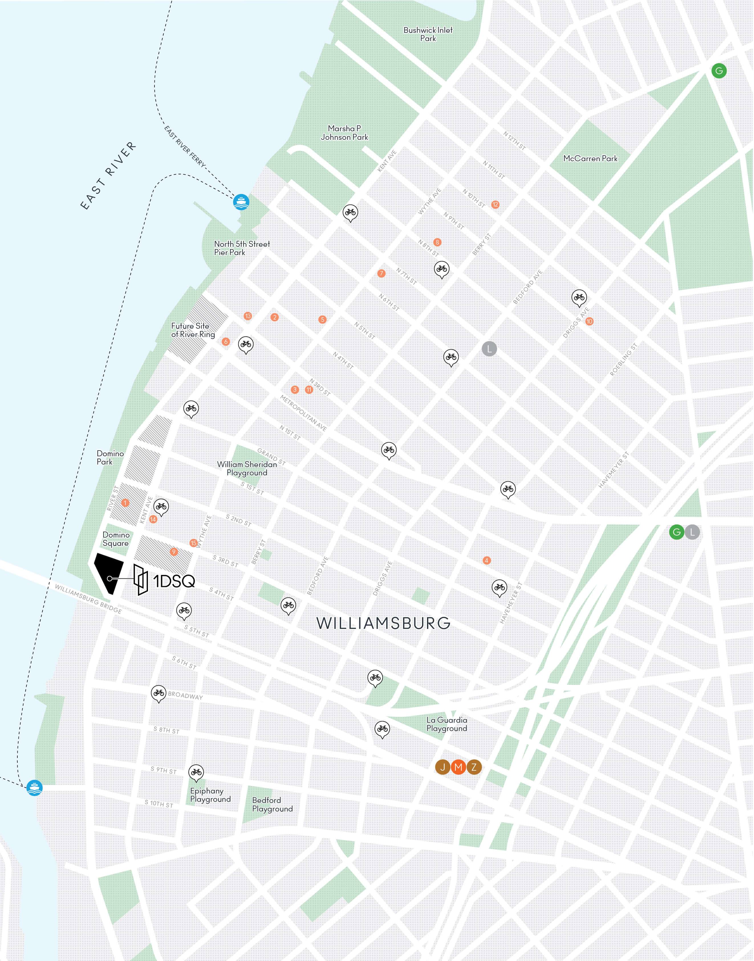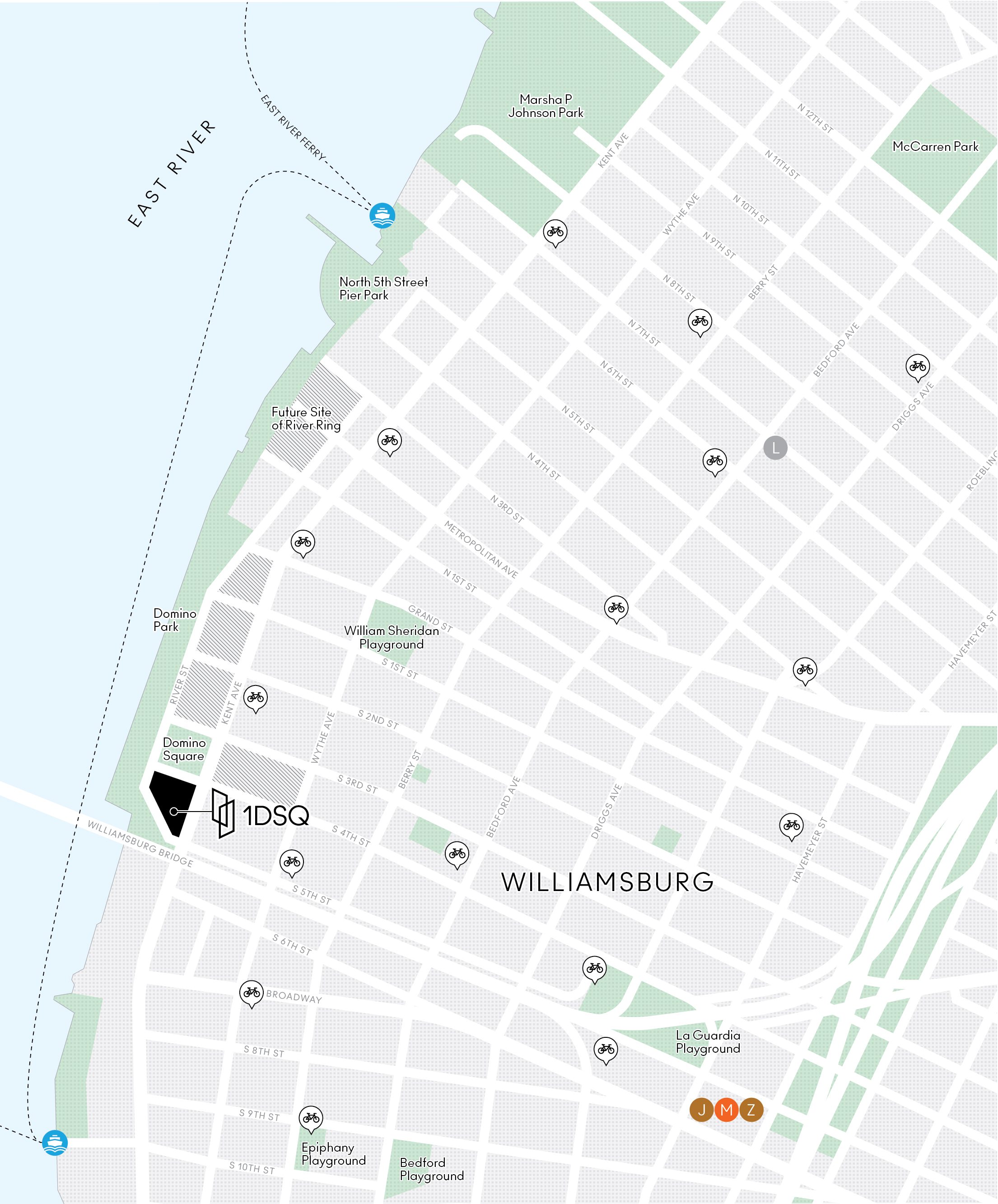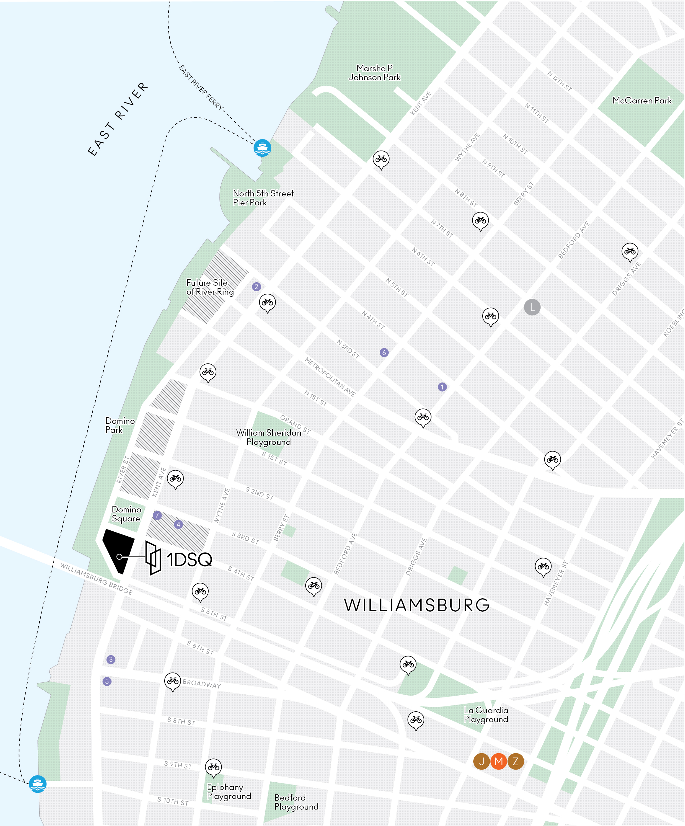 One Domino Square is nestled on the Williamsburg waterfront besides one of the city’s most celebrated green spaces, Domino Park. Residents are invited to engage with the lush landscapes of the park while immersing themselves in the dynamic culture of Williamsburg, Brooklyn’s most vibrant neighborhood. Many celebrated restaurants, independent boutiques and iconic cultural institutions are only moments away.